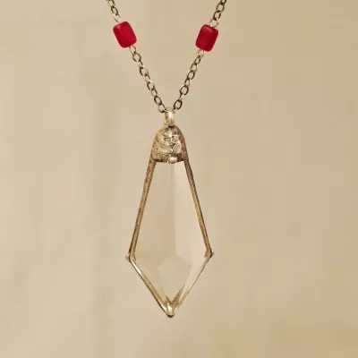 Ručně cínovaný přívěsek 2,3 x 5,3 cm, patinovaný. Starostříbrný řetízek 61,5 cm, zapínání karabina + protikroužek. Náhrdelník je doplněn matnými skleněnými korálky v červené barvě.