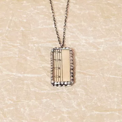 Netradiční náhrdelník s vintage partiturou. Do cínovaných přívěsků je zakomponována originální část starodávných not. Přívěsky jsou oboustranné, na každé straně je jiná část. Vintage tisk je vložený mezi dvě zabroušená sklíčka zasazená v ručně cínovaném rámečku.