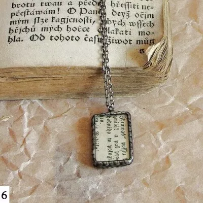 Ručně vyrobený náhrdelník s vintage tiskem. Do cínovaného přívěsku je zakomponována originální část modlitby z pouti na svatou Horu blíže Příbrami z roku cca 1857. Přívěsek je oboustranný, text psaný švabachem, na každé straně je jiná část. Tato limitovaná kolekce obsahuje pouze 12 originálních přívěsků. Vintage tisk je vložený mezi dvě zabroušená sklíčka zasazená v ručně cínovaném rámečku.
