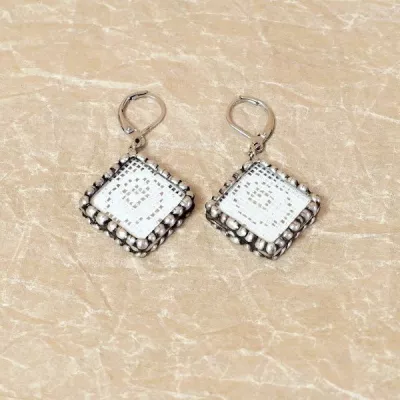 Cínované náušnice se zakomponovanou starožitnou krajkou - kolekce „Krajková dečka". Náušnice jsou oboustranné, vintage krajka je vložená mezi dvě zabroušená sklíčka zasazená v ručně cínovaném rámečku.
