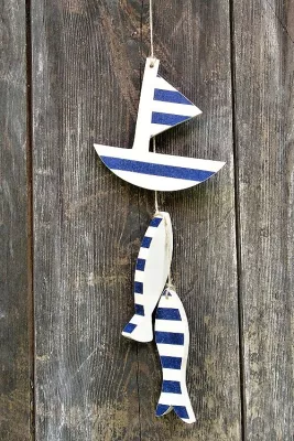 Námořnická dekorace ryba. Ručně vyrobeno technikou decoupage, jemně patinováno. Dekorace je oboustranná, je možno zavěsit i do prostoru. Jednotlivé kusy se mohou mírně lišit umístěním vzoru. Otvor pro zavěšení na šňůrku nebo stužku cca 4 mm.