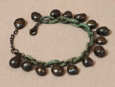 Působivý náramek s patnácti černými říčními perlami a tmavě zelenou hedvábnou šňůrkou.