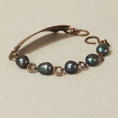 Náramek z ručně tepané mědi v kombinaci s černými perlami.