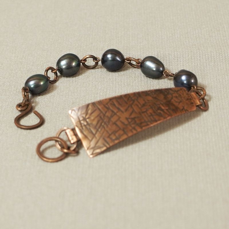 Tepaný a patinovaný měděný díl 2 x 6,5 cm, černé sladkovodní perly 9 - 10 mm. Zapínání ve tvaru S, jako protidíl je možné použít koncové očko měděného dílu, nebo kroužek na konci náramku. Obvod náramku je proto variabilní 17 cm nebo 18 cm. Na přání je možné náramek prodloužit.
