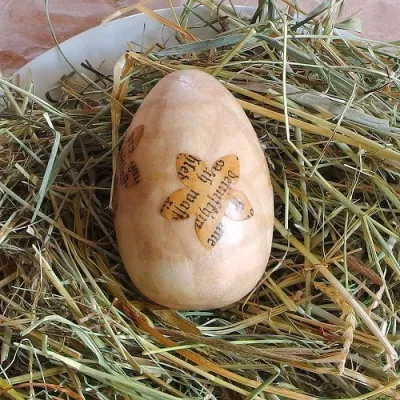 Velikonoční vejce ve vintage stylu. Neobvyklá, ručně zdobená vajíčka se 4 kvítky. Přírodní světle hnědé tóny a mramorovaný podklad vajíčka doplňuje středně hnědá barva kytiček s černým písmem. Jednotlivé kusy se mohou mírně lišit umístěním vzoru.