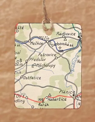Tyto recyklované štítky s motivem cestování jsou jednotlivě, ručně vyrobené ze starých map. Na každé visačce je jiný motiv, jiná část mapy. Visačky jsou oboustranné, s patinou na okrajích.
